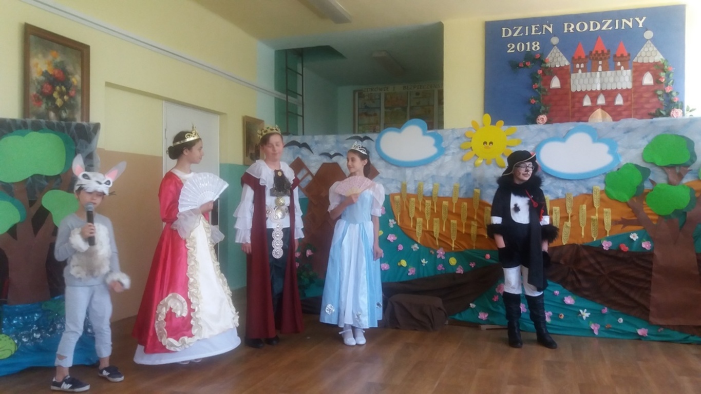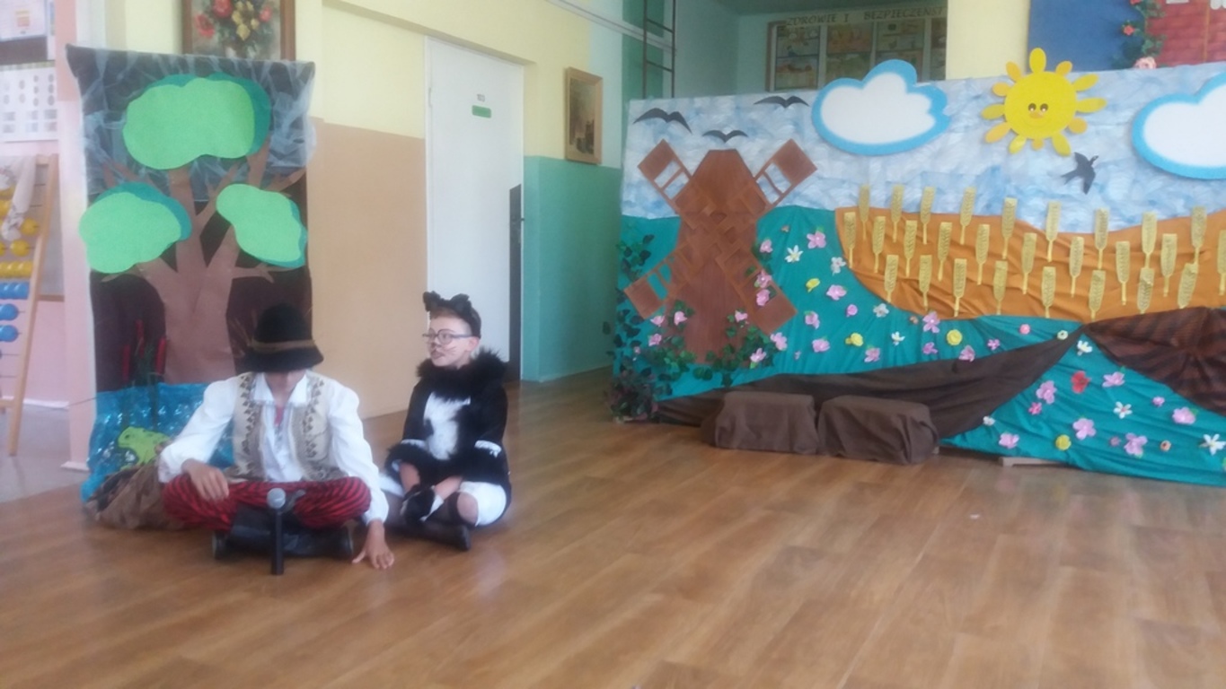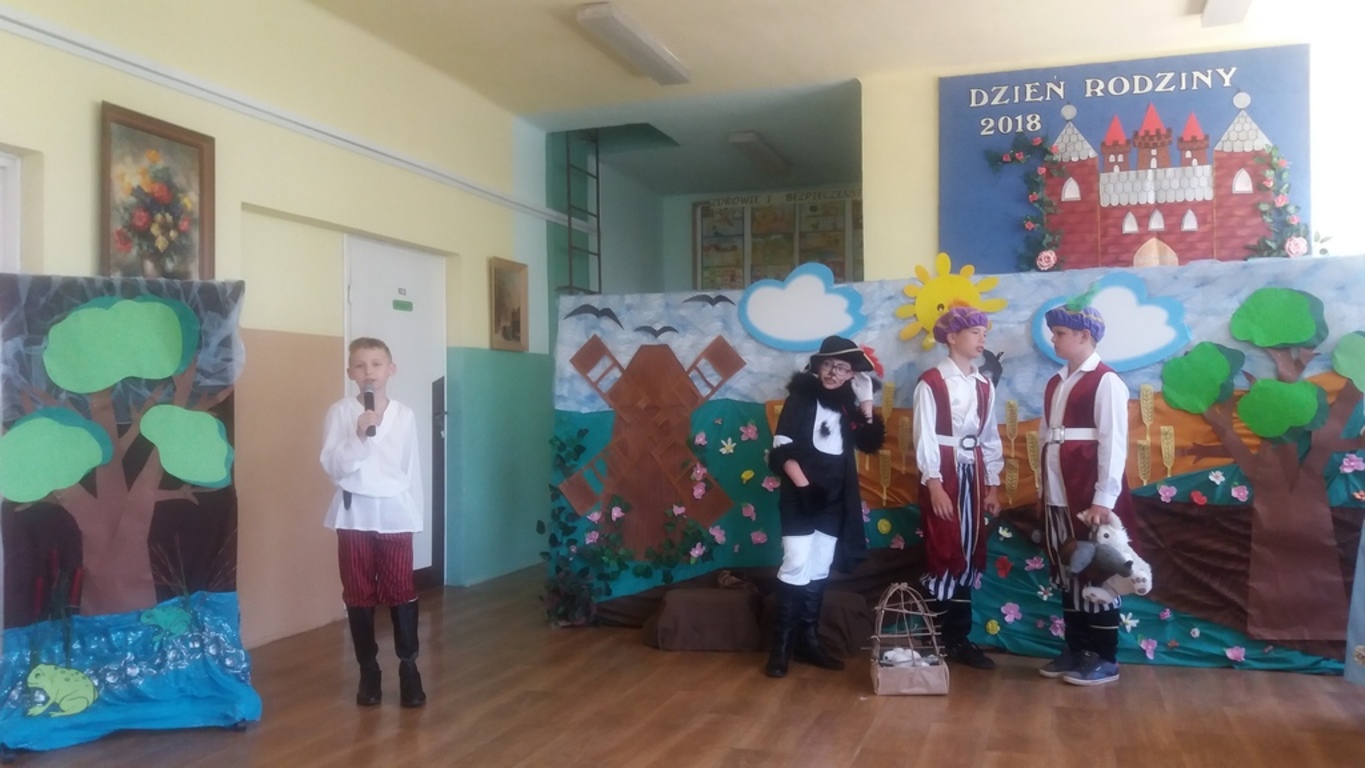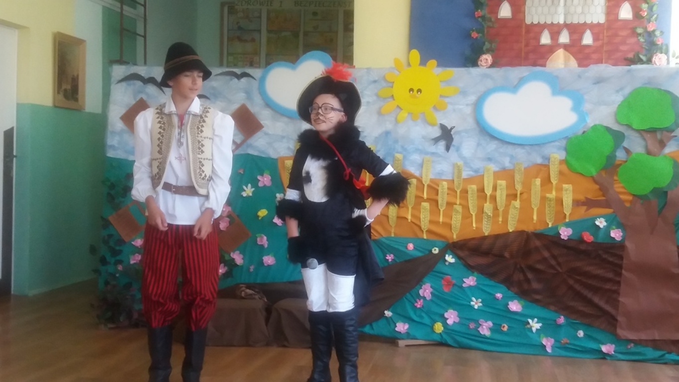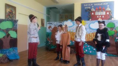 Następnie głos oddano artystom, którzy począwszy od najmłodszej grupy- dzieci 4-5 letnie, aż po uczniów klasy VII pełni zapału i zaangażowania deklamowali wierszyki, wyśpiewali z serca piosenki. Ponadto dzieci klas I-V wcieliły się w bajkowe postacie i zaprezentowali inscenizację bajki pt.: ,,Kot w butach”. Spektakl przeniósł widzów w krainę bajki. Jak każda bajka, ta także miała swój morał.