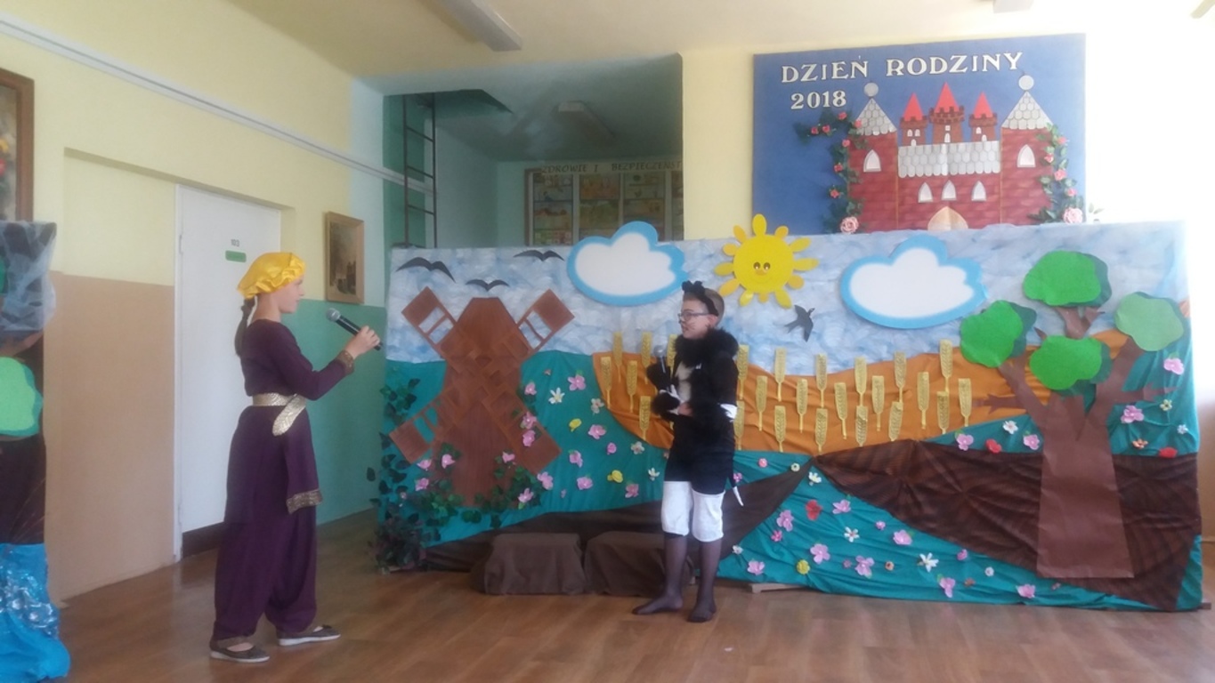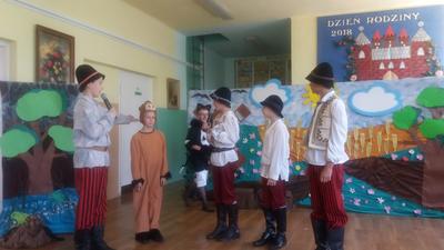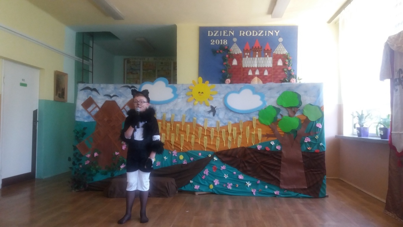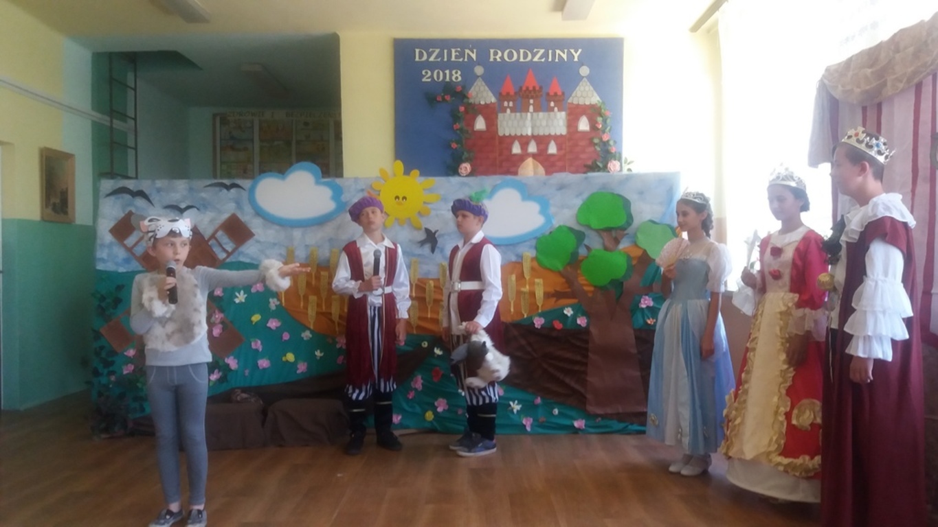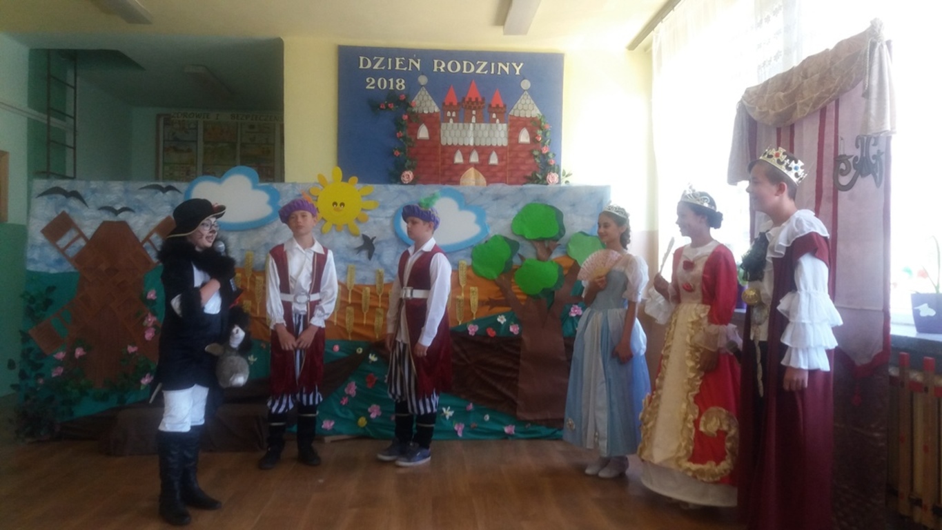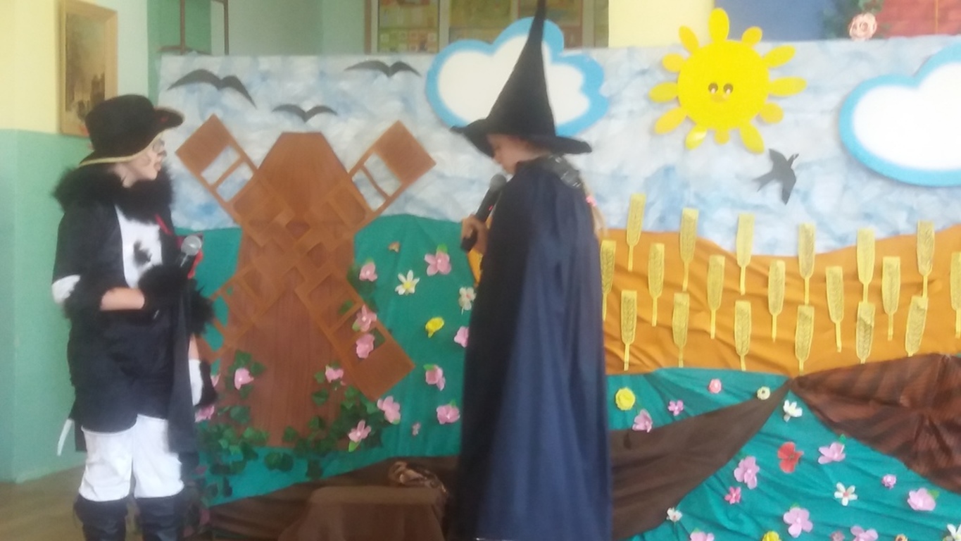 Następnie głos oddano artystom, którzy począwszy od najmłodszej grupy- dzieci 4-5 letnie, aż po uczniów klasy VII pełni zapału i zaangażowania deklamowali wierszyki, wyśpiewali z serca piosenki. Ponadto dzieci klas I-V wcieliły się w bajkowe postacie i zaprezentowali inscenizację bajki pt.: ,,Kot w butach”. Spektakl przeniósł widzów w krainę bajki. Jak każda bajka, ta także miała swój morał.