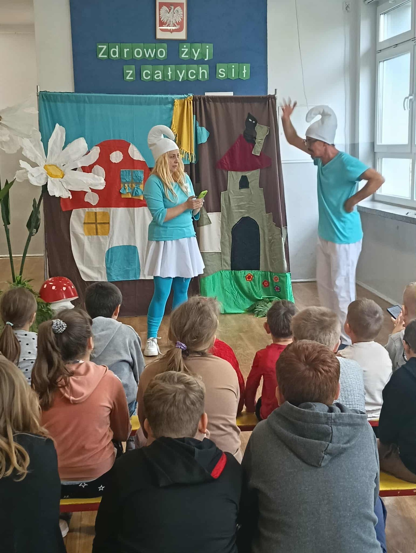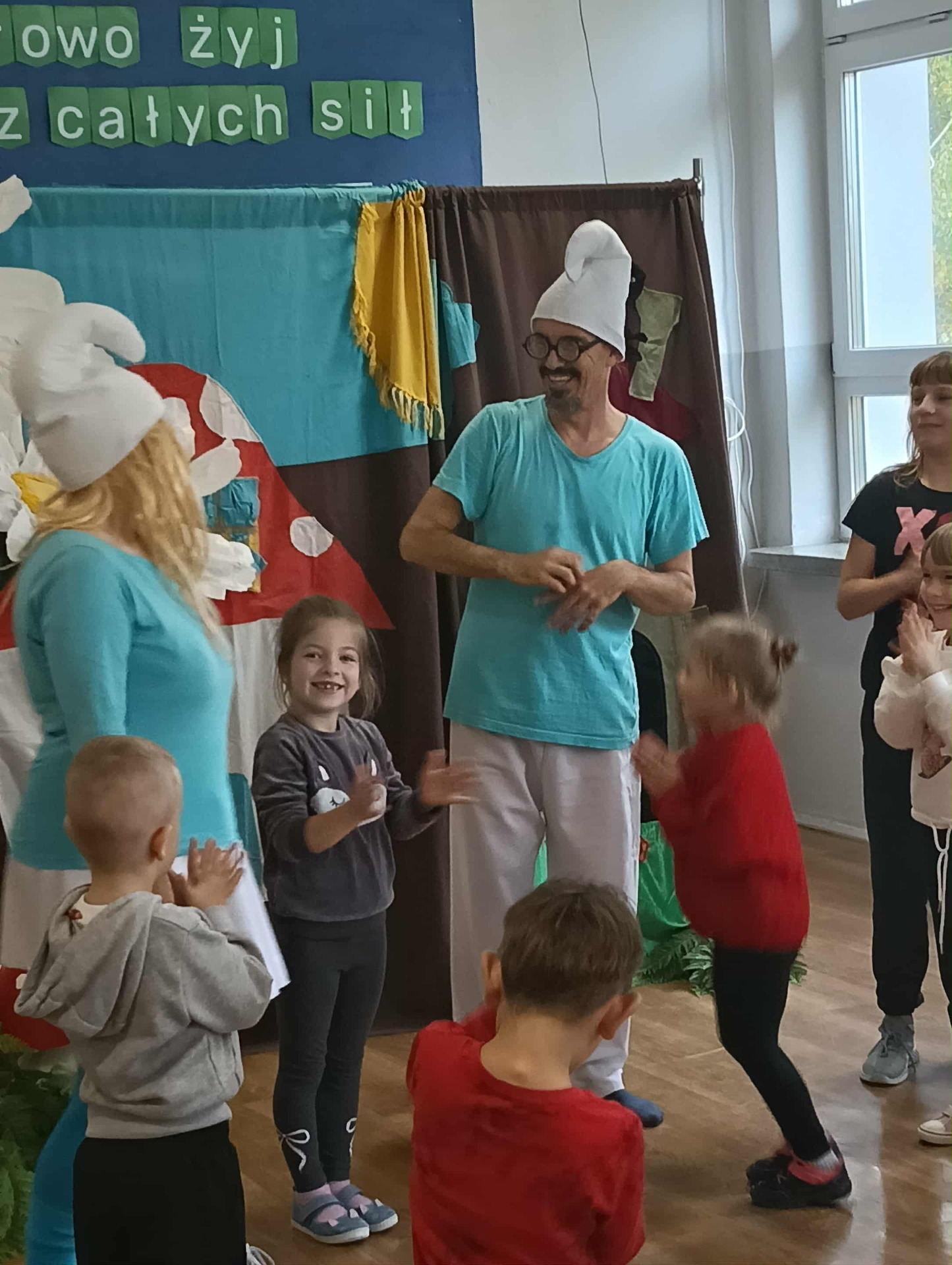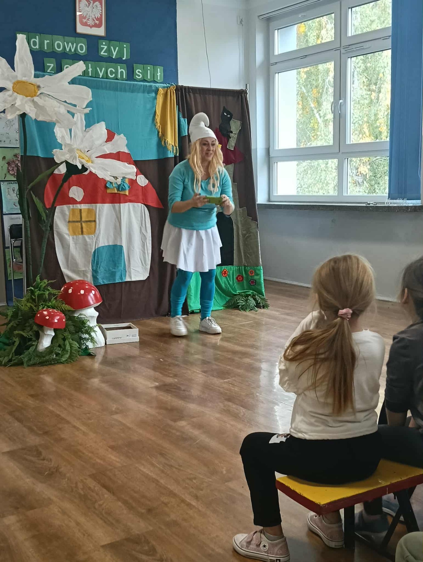 16.10.2025r. uczniowie klas 0-IV obejrzeli spektakl przygotowany przez Teatr z Kapelusza z Krakowa pt. „Smerfetka kontra Ważniak”. Przedstawienie miało charakter profilaktyczny i poruszało bardzo aktualny temat bezpieczeństwa w Internecie. Spektakl opowiadał o Smerfetce, która bardzo lubiła robić sobie zdjęcia i publikować je w sieci. Dziewczynka nie zdawała sobie sprawy z zagrożeń, jakie mogą z tego wynikać. Pewnego dnia w Internecie poznała chłopca o imieniu Krzyś, z którym zaczęła pisać. W rzeczywistości jednak za Krzysia podawał się Gargamel. Smerfetka, nieświadoma niebezpieczeństwa, zdradziła mu wiele informacji o sobie, a nawet podała swój adres. Gdy doszło do spotkania, okazało się, że Krzyś nie istnieje, a za ekranem ukrywał się ktoś zupełnie inny. Spektakl w ciekawy i przystępny sposób pokazał, jak łatwo można zostać oszukanym w Internecie. Aktorzy wykorzystali znane postacie ze świata Smerfów, aby w zabawny, ale pouczający sposób przekazać ważne treści. Całość była pełna humoru, piosenek i kolorowych scen, dzięki czemu spektakl bardzo podobał się uczniom. Przesłanie przedstawienia było bardzo ważne – nie wolno ufać nieznajomym w sieci, podawać swoich danych ani umawiać się z osobami poznanymi przez Internet. Dzięki temu spektaklowi uczniowie mogli lepiej zrozumieć, jakie zagrożenia mogą czyhać w wirtualnym świecie i jak się przed nimi chronić.