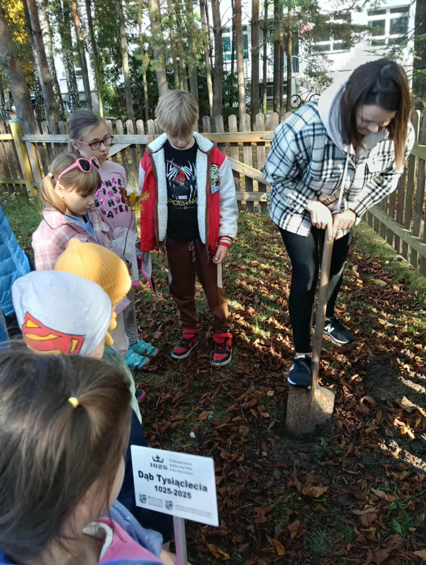 Uczniowie, nauczyciele oraz dyrekcja naszej szkoły włączyli się w ogólnopolską akcję „Tysiąc Dębów na Tysiąclecie Państwa Polskiego”, sadząc na terenie szkoły symboliczny Dąb Tysiąclecia 1025–2025. Inicjatywa, która narodziła się w województwie świętokrzyskim z pomysłu Marszałek Renaty Janik, ma na celu uczczenie tysiącletniej historii polskiej państwowości. Akcja wpisuje się w obchody rocznicy koronacji króla Bolesława Chrobrego – pierwszego koronowanego władcy Polski. Poprzez posadzenie dębu społeczność szkolna wyraziła szacunek dla narodowej tradycji oraz pamięć o bogatej historii naszego kraju, a także przyczyniła się do ochrony przyrody i promowania postaw proekologicznych.