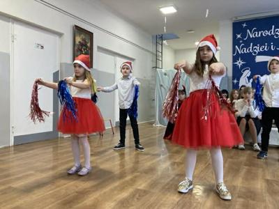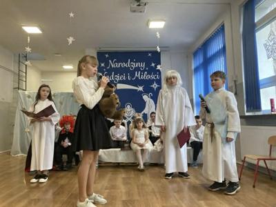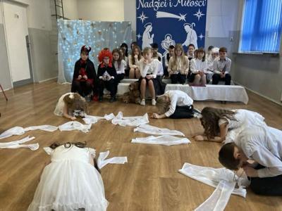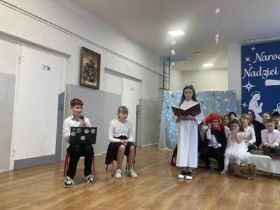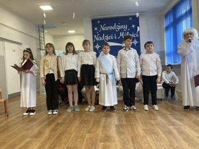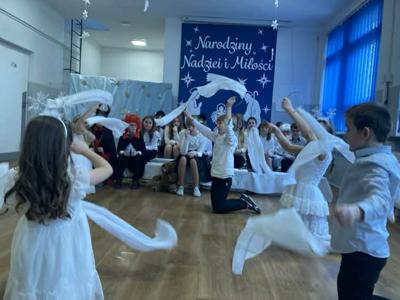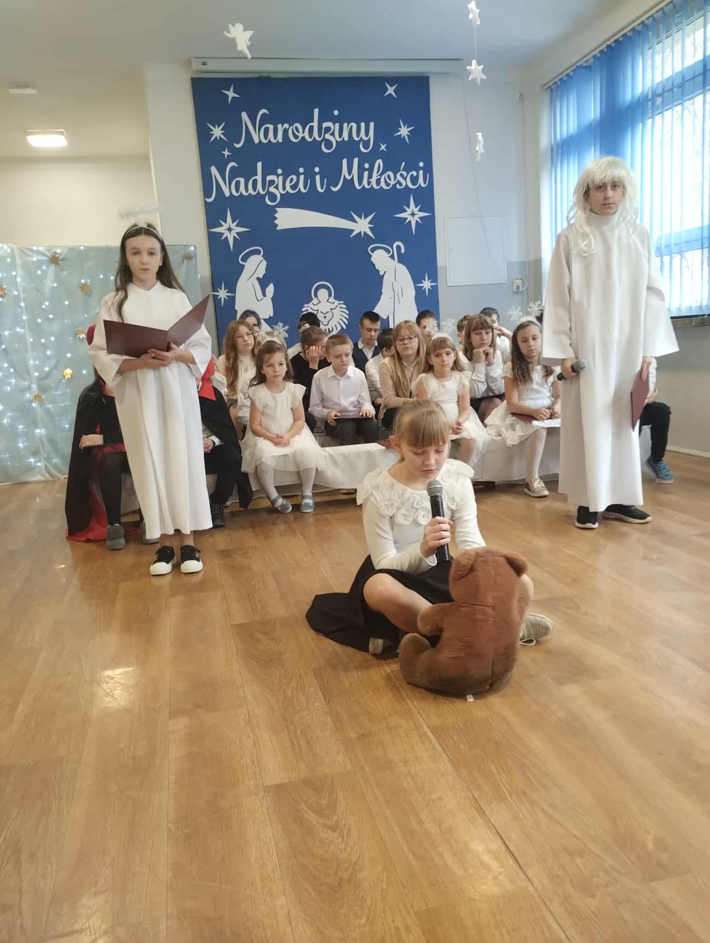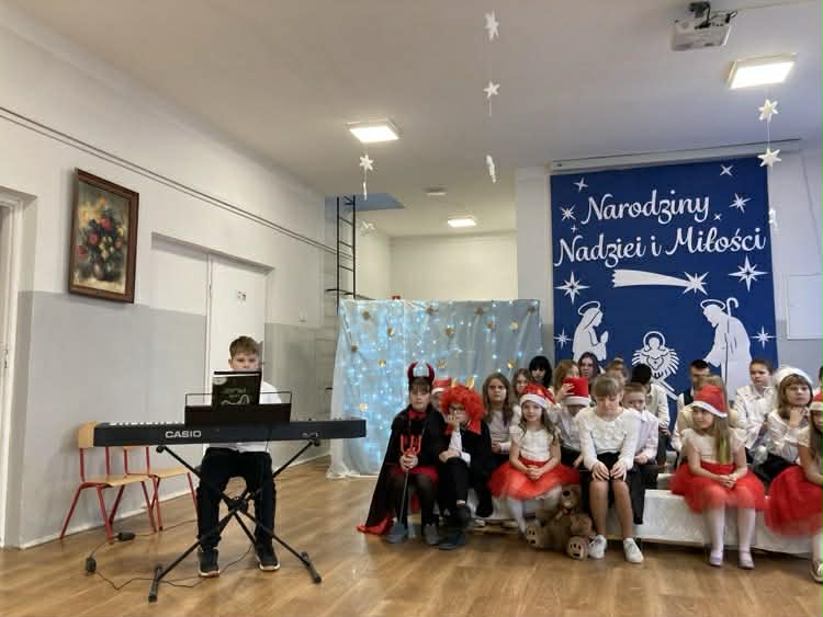 Spektakl był przeplatany pięknymi kolędami, pastorałkami i tańcem aniołów tworząc niepowtarzalny, świąteczny nastrój. Uroczystość rozpoczęła się nastrojową grą na keyboardzie w wykonaniu ucznia Dawida Bednarczyka, która wprowadziła zgromadzonych w klimat Bożego Narodzenia.