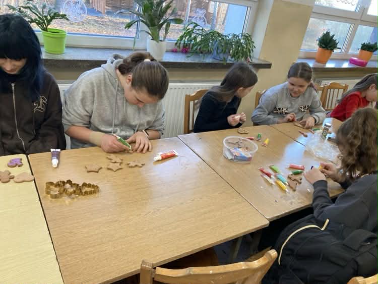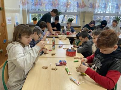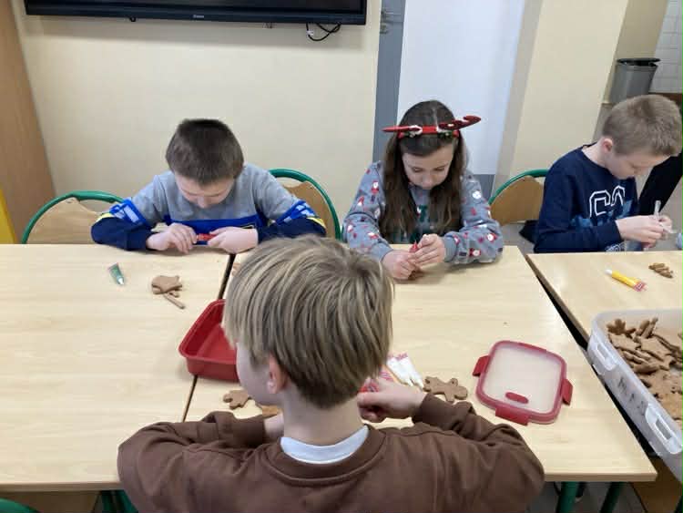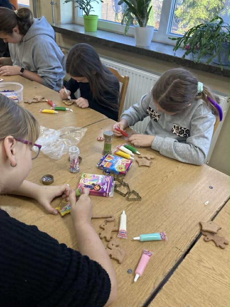 W naszej szkole odbyło się radosne, świąteczne wydarzenie – pieczenie i dekorowanie pierników. Starsi uczniowie z wielkim zaangażowaniem piekli pierniki, aby młodsi koledzy i koleżanki mogli je później ozdabiać. Była to doskonała okazja do współpracy między uczniami w różnym wieku oraz do budowania wzajemnej życzliwości. Podczas zajęć panowała miła, ciepła atmosfera, pełna uśmiechów i świątecznego nastroju. Ciasto na pierniki zostało przygotowane przez panie Monikę Kosiarską oraz Beatę Roman za co serdecznie dziękujemy. Pięknie udekorowane pierniki dzieci zabrały do domów, aby podzielić się nimi z bliskimi i wprowadzić świąteczną radość także poza mury szkoły.