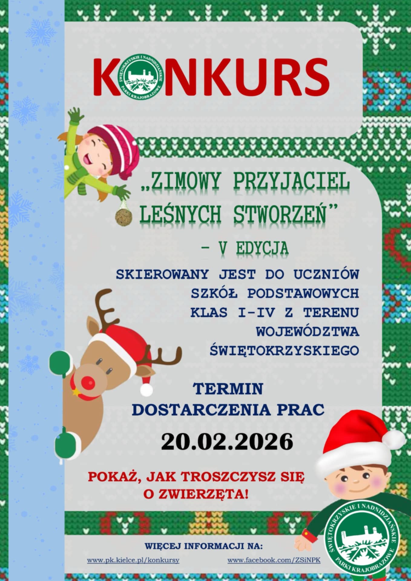 Zapraszamy do udziału w konkursie plastycznym ,,Zimowy Przyjaciel Leśnych Stworzeń". Zespół Świętokrzyskich i Nadnidziańskich Parków Krajobrazowych w Kielcach organizuje V już edycję konkursu plastycznego pn. „Zimowy Przyjaciel Leśnych Stworzeń”. Konkurs skierowany jest do uczniów klas I–IV szkół podstawowych z terenu województwa świętokrzyskiego. Jego głównym celem jest rozwijanie wśród najmłodszych zamiłowania do przyrody, uwrażliwienie na piękno otaczającego nas świata, kształtowanie szacunku wobec zwierząt oraz doskonalenie umiejętności rozpoznawania gatunków żyjących w naszym regionie. Dodatkowo przedsięwzięcie pozwala na twórcze wyrażanie emocji i myśli, wspiera kreatywność oraz zdolności artystyczne dzieci. Na uczestników konkursu czekają atrakcyjne nagrody, a wyróżnione prace zostaną zaprezentowane na stronie internetowej Parków oraz w mediach społecznościowych.